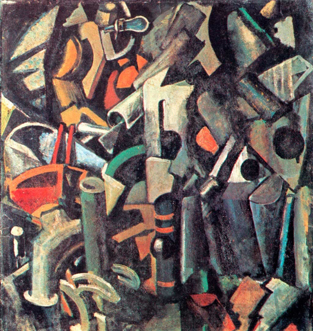 An example of his Futurist work is The Truck, dated variously to 1914 and 1917, while in The Studio of Wonders Cubo-Futurist decompositions are superimposed on a representation of objects drawn from Carrà’s Metaphysical Painting, whose influence can also be seen in The Lamp, of 1919: here the figure is an inexpressive and melancholy manikin, depicted in a domestic interior dominated by a sense of solitude that anticipates the existential anguish typical of Sironi’s poetics. He never shared the faith in progress and the myth of the machine that would characterize the Futurists and his urban scenes (Urban Landscape with Truck of 1921) represent isolated, gloomy and orderly suburbs, mirrors of a sense of alienation which is that of humanity itself.