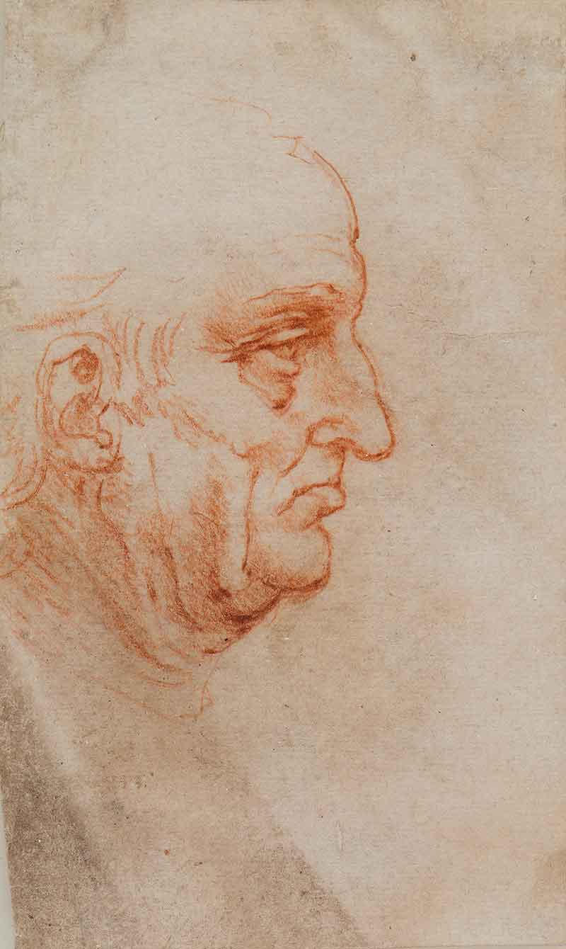 The old man depicted on this sheet seems to have been studied from life, however; in fact, wrinkles branch out along his forehead in a natural way, his eyelids are naturally drooping, and even his neck shows the characteristic marks of an old man. His ugliness is therefore real and believable rather than grotesque and caricatured.