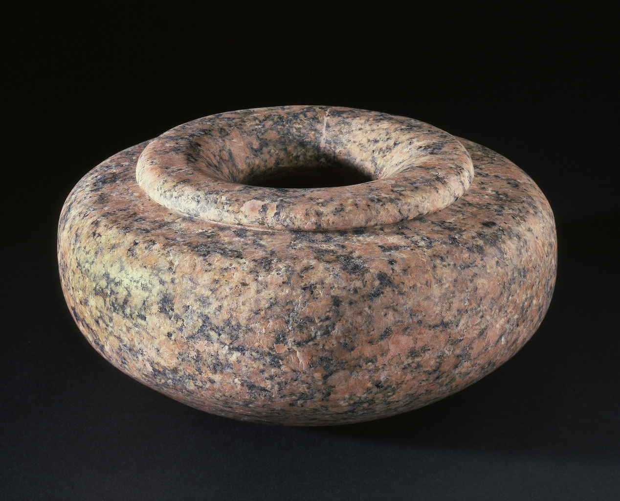 The Aswan red granite (syenite) vessel is worked by drill and chisel.